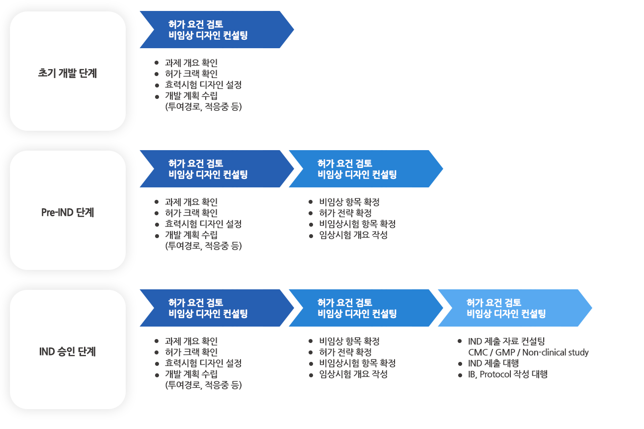 IND와 NDA 분야에서 해외 진출의 활로를 개척하기 위한 지원을 제공합니다.